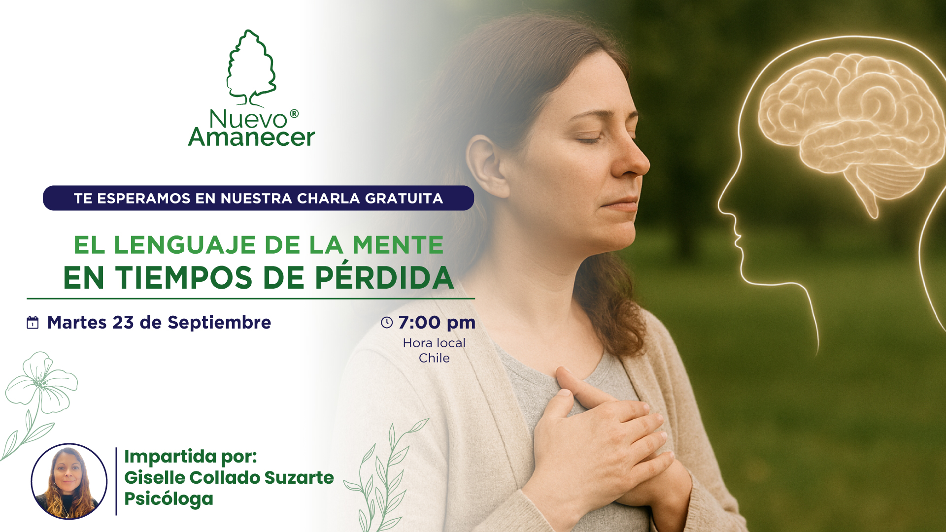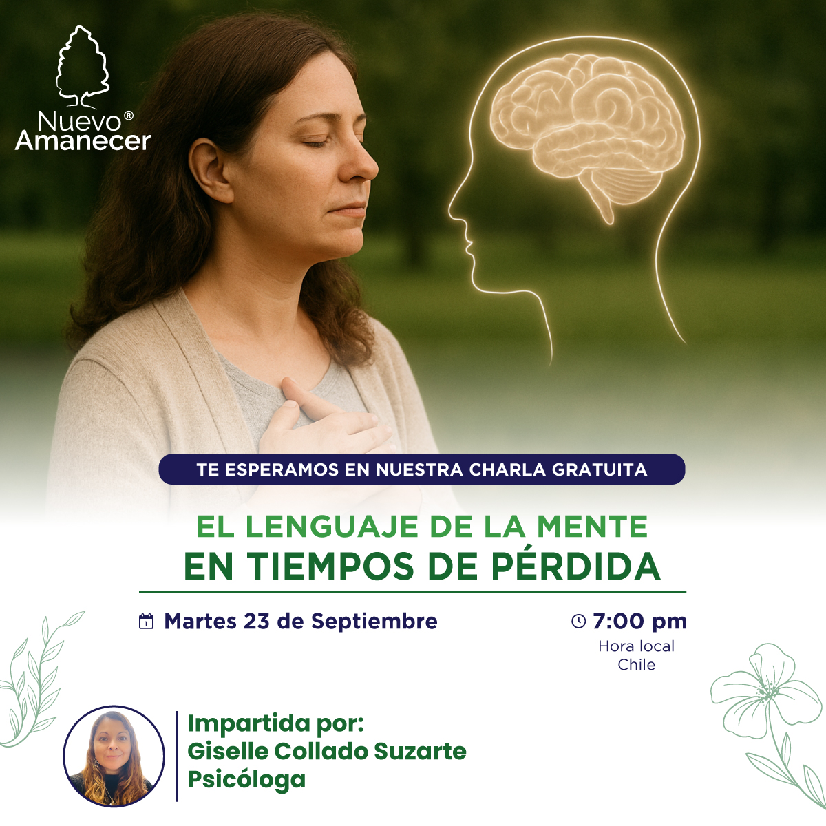 La charla será impartida por la Psicóloga Giselle Collado Suzarte el martes 23 de septiembre a las 7:00 pm (hora Chile), en modalidad online a través de Zoom y Facebook Live.