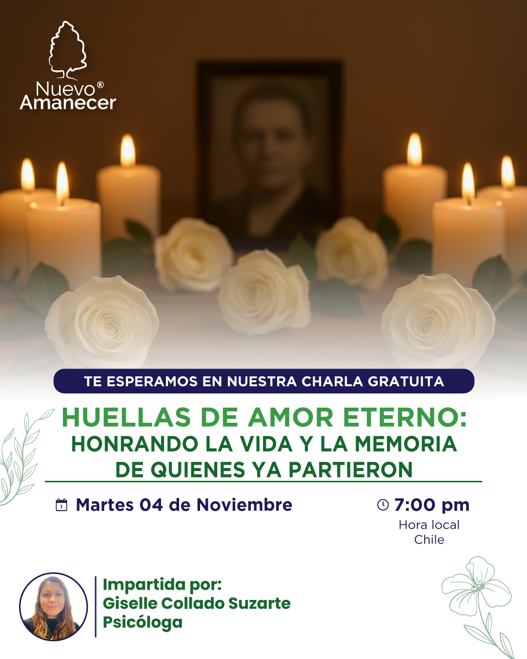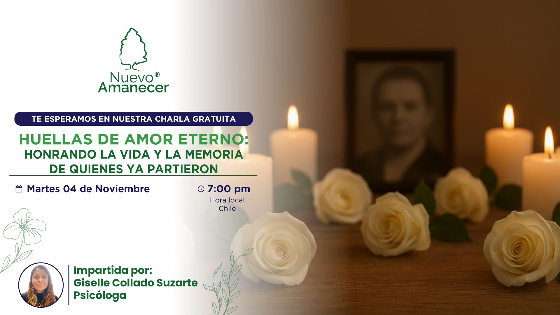 Esta charla es una invitación a mirar el duelo con sensibilidad, a comprender tus emociones y a encontrar paz en la memoria de quienes partieron.